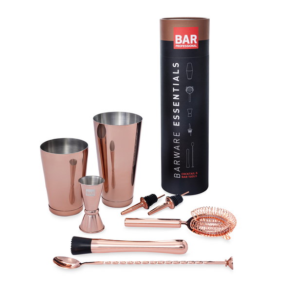 Bar Professionalin seitsenosainen baaritarvikesetti ruostumattomasta teräksestä kuparin värisenä. Setti sisältää kaksiosaisen Boston Shakerin, sekoituslusikan, siivilän, murskaimen, Jigger-kaatomitan (ei CE-merkitty) ja kaksi kaatonokkaa. Laadukas setti toimitetaan mustassa, lieriön muotoisessa pakkauksessa, joten se sopii hyvin myös lahjaksi!